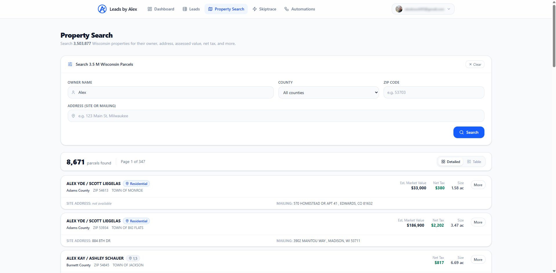 Every parcel in Wisconsin at your fingertips. Look up any property to see the verified owner, assessed value, mailing address, and more before you ever make a call.
